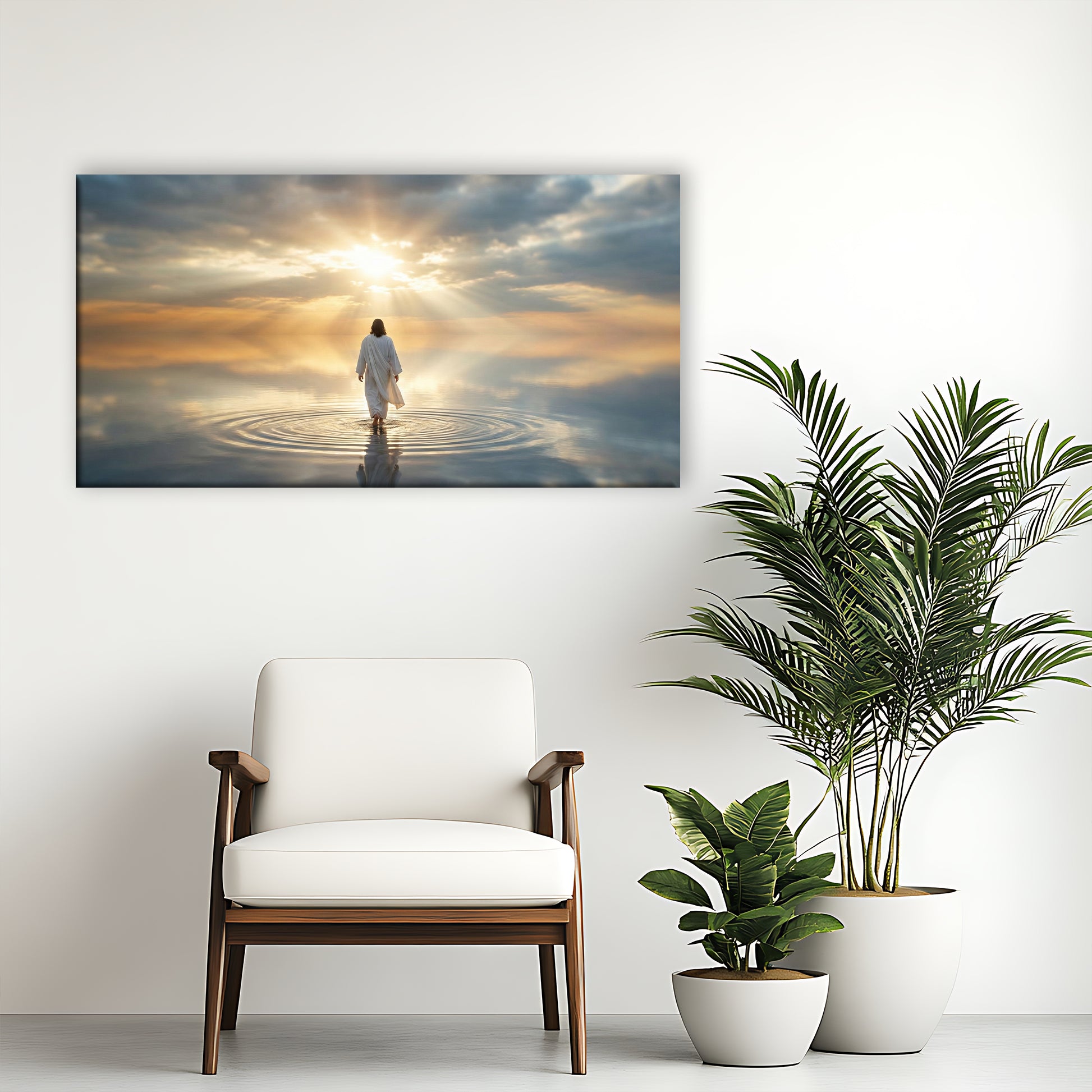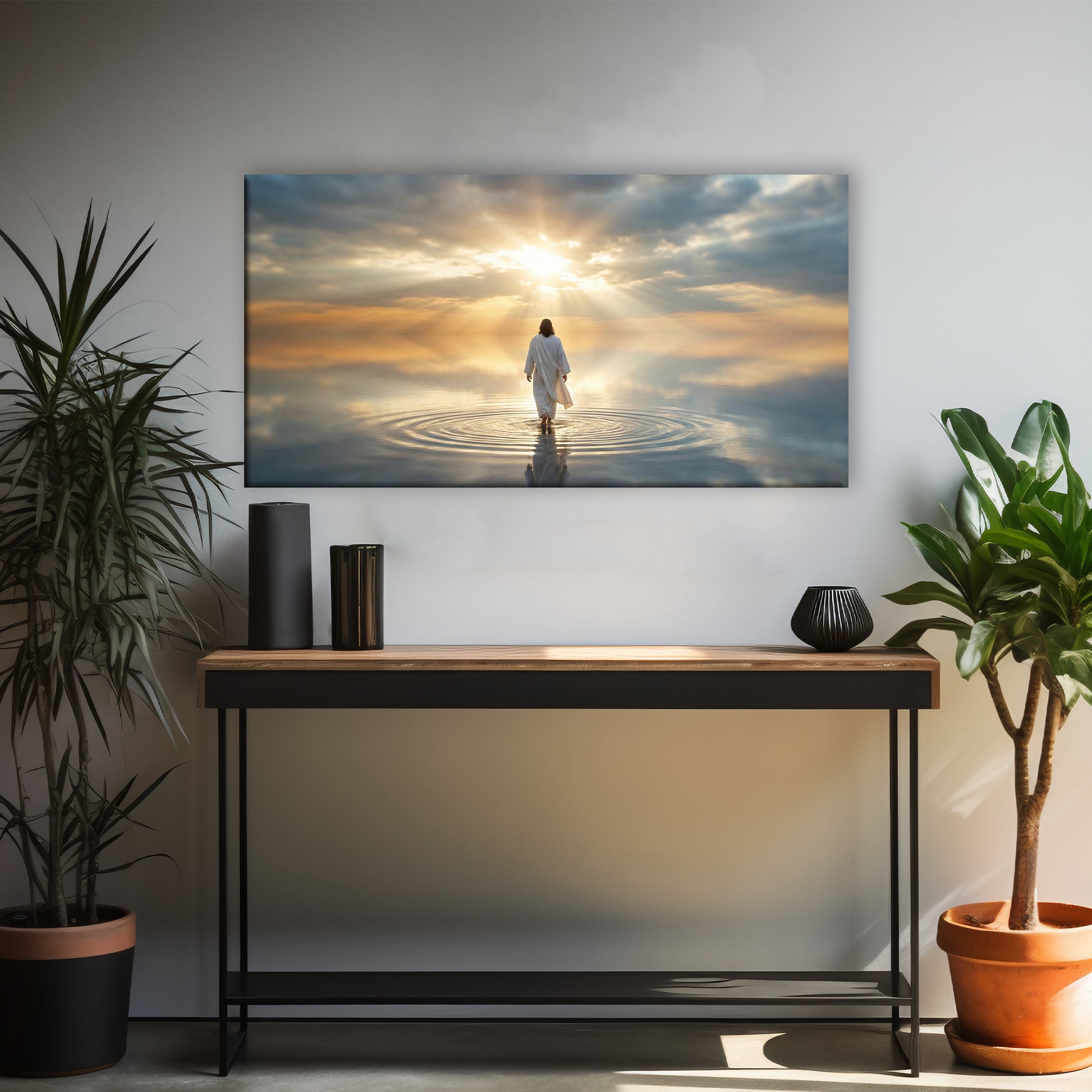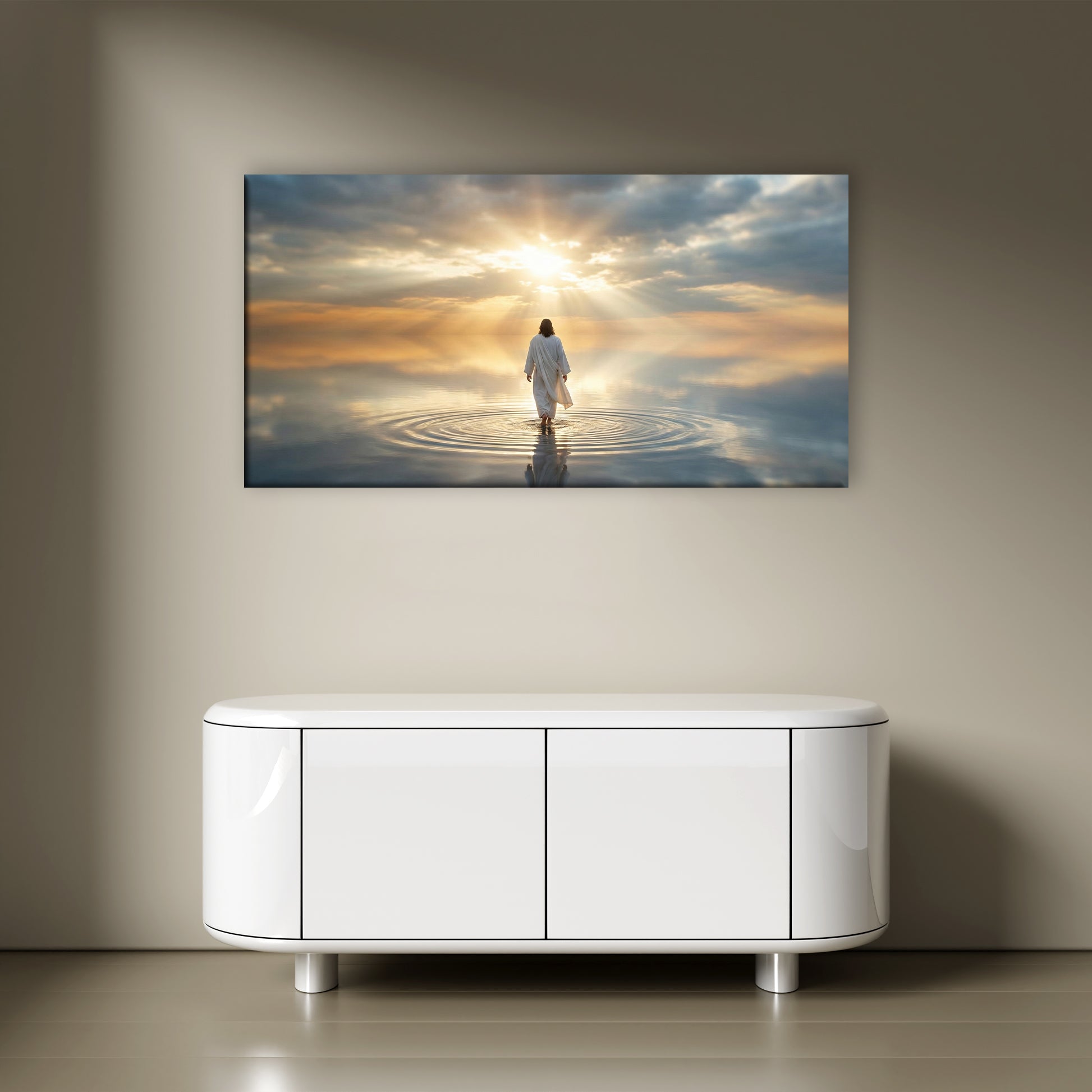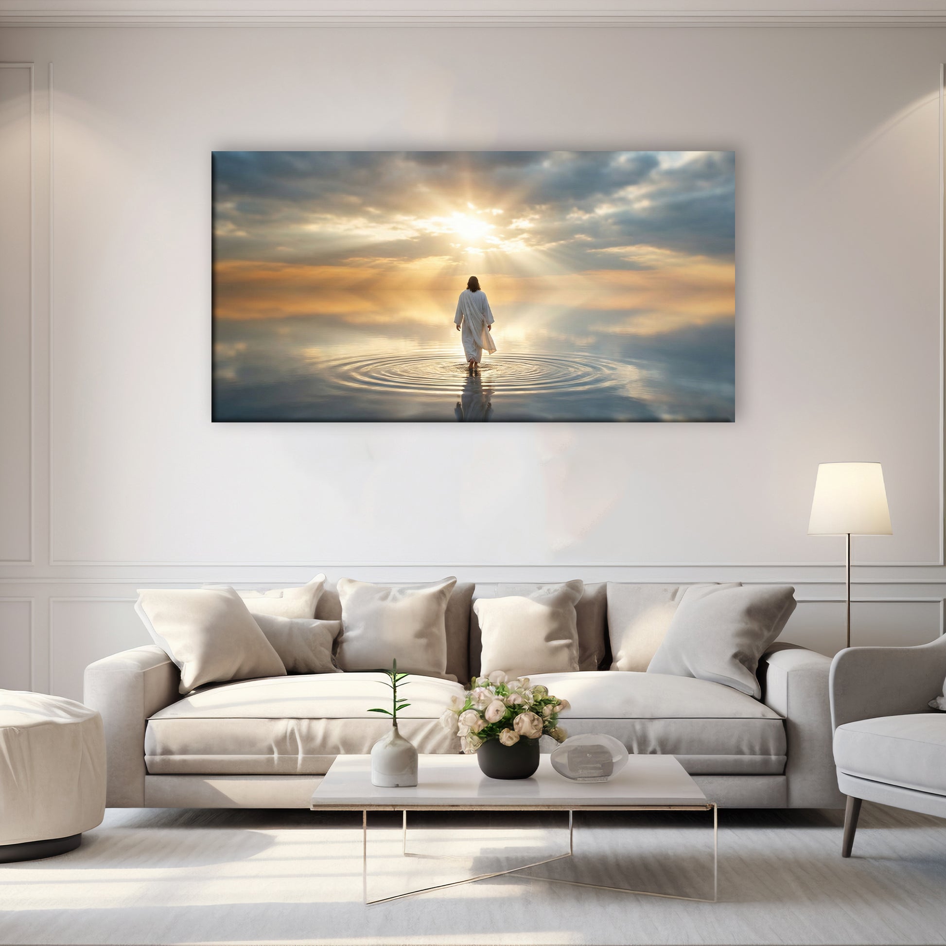 This inspiring canvas beautifully portrays the powerful moment of Jesus walking on water, representing unwavering faith, hope, and divine protection. The gentle light in the sky and the calm movement of the water create a peaceful and uplifting scene that instantly brings a sense of serenity to any space.