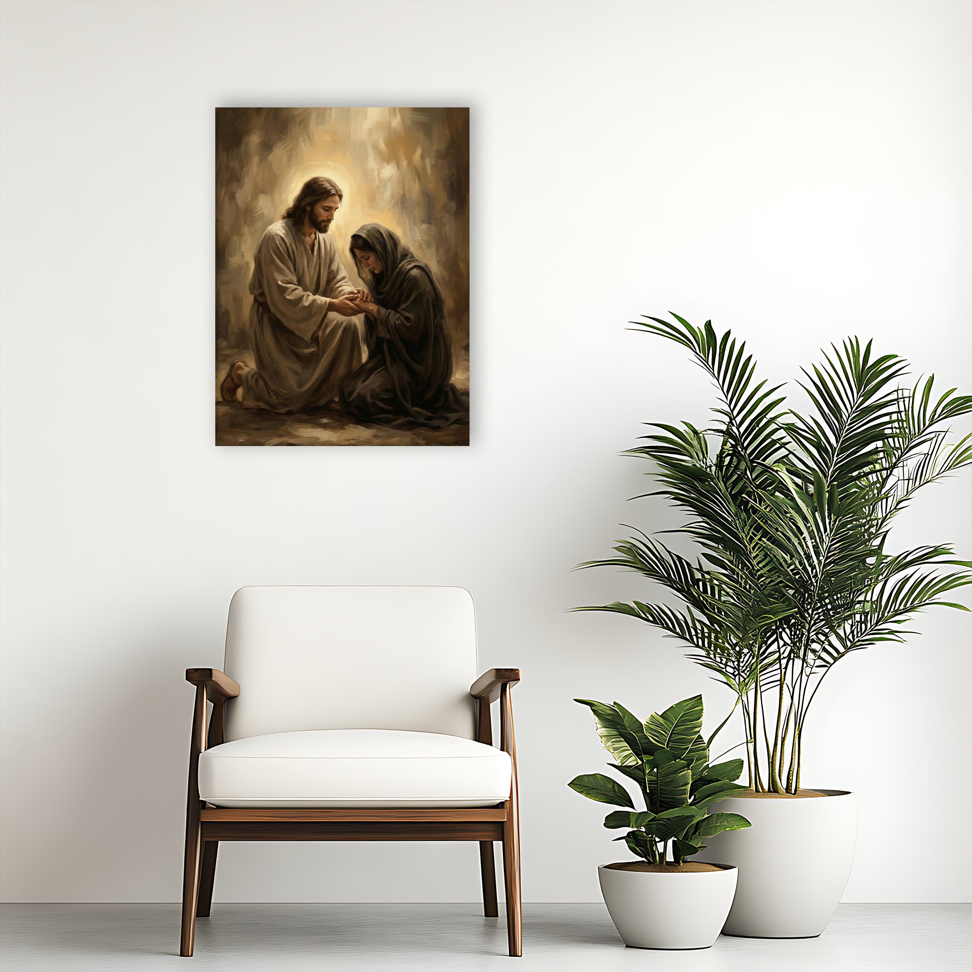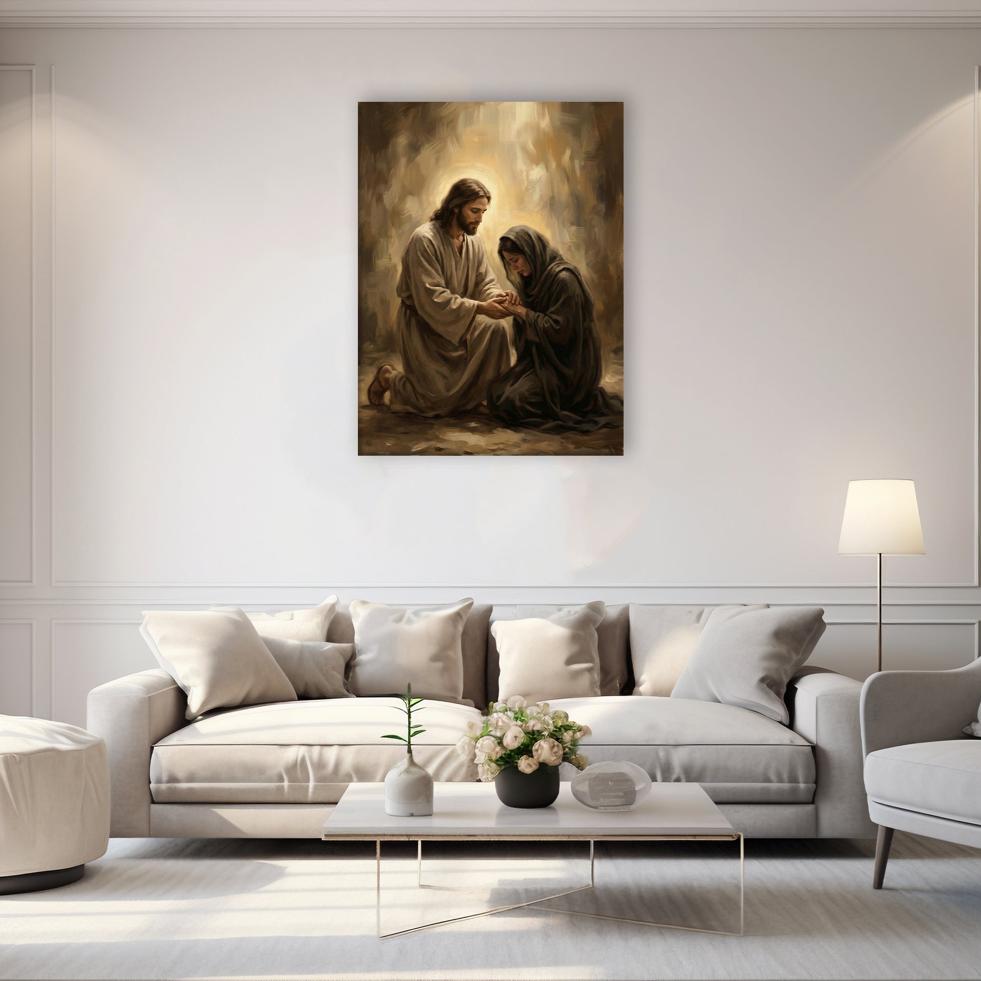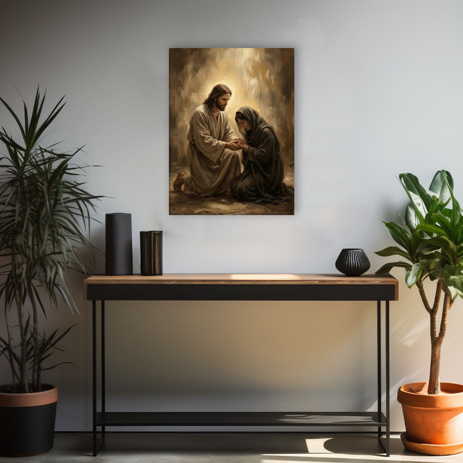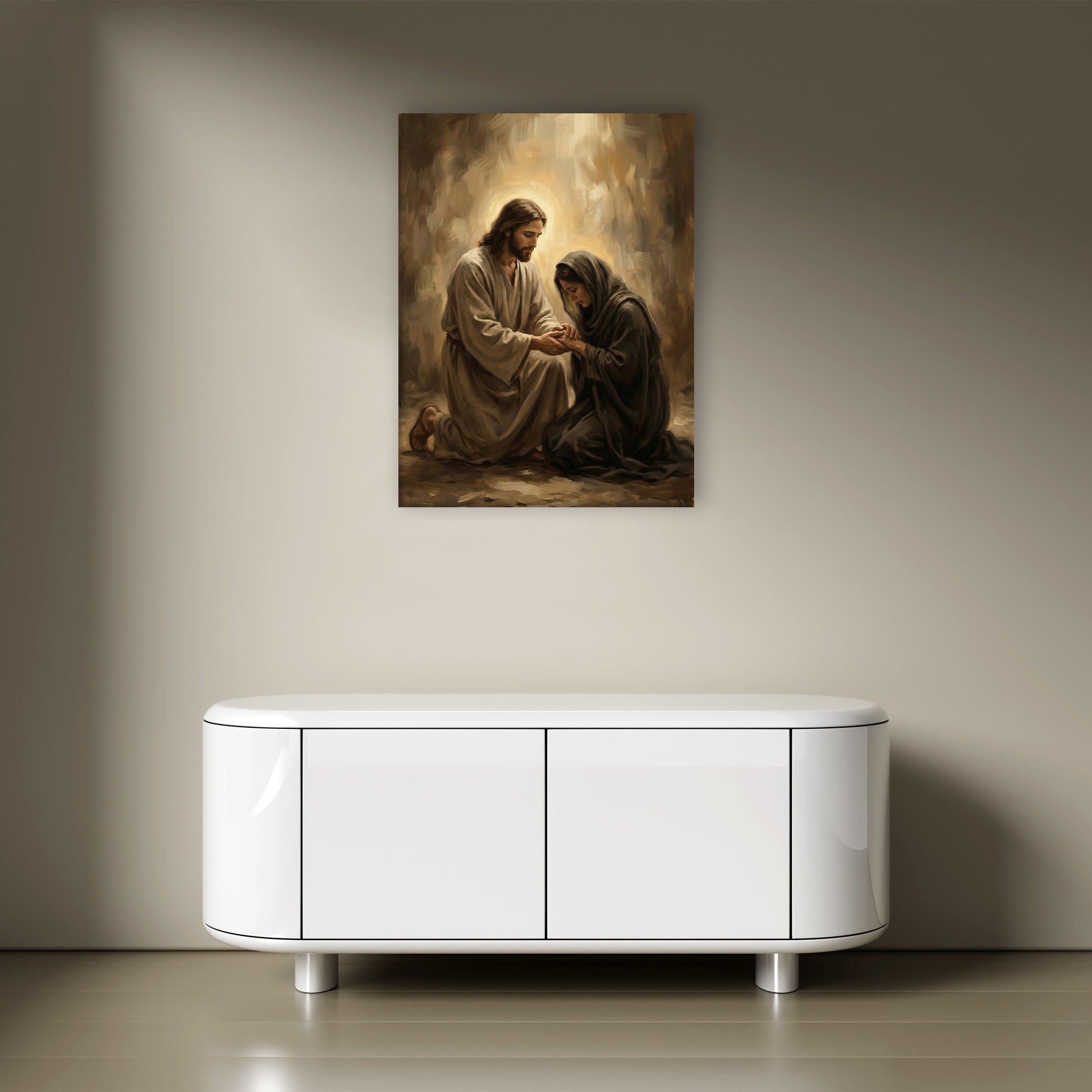 There is something so deeply moving about the way the light hits this scene. It captures a tender moment of empathy, showing a figure kneeling beside someone in need, offering nothing but peace and a helping hand. The earthy browns and soft ambers give it a timeless, organic feel that brings a sense of grounding to your home. We love this piece for a living room or a hallway because it greets everyone who enters with a message of compassion and hope. It’s more than just a painting; it’s a visual representation of being watched over and cared for.